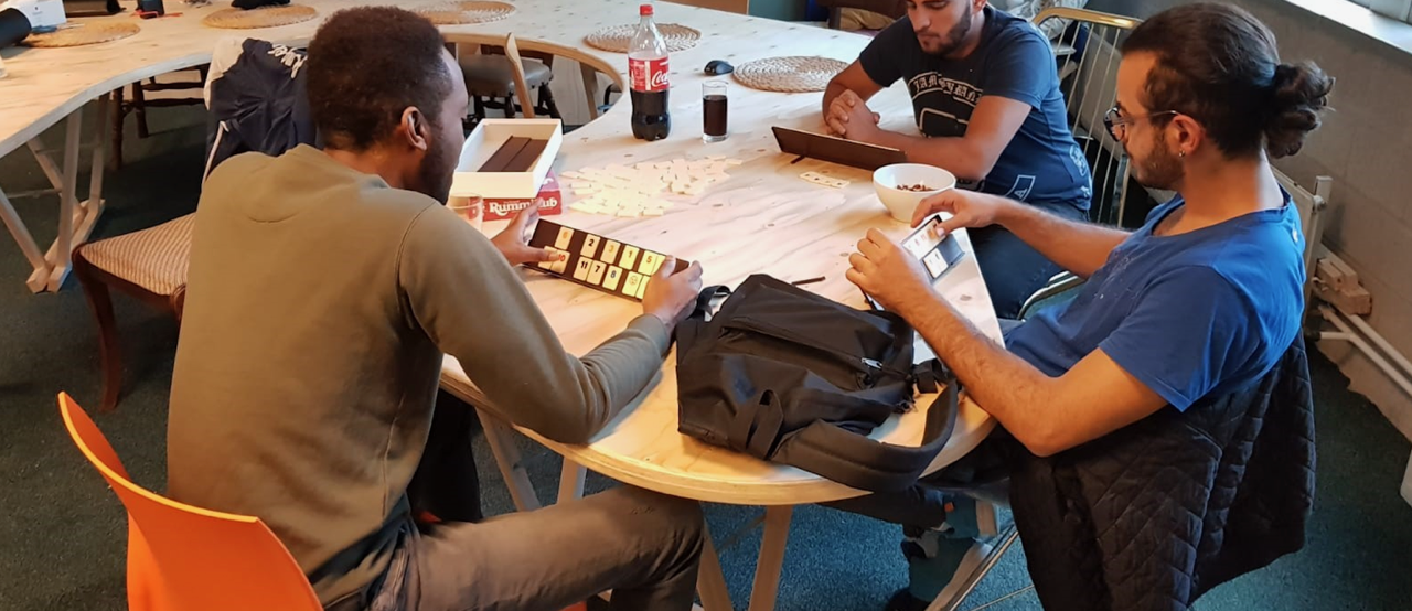 Arnold Homan, voorheen werkzaam bij partner van het eerste uur INBO Architecten, ontwierp en maakte een robuuste ontmoetingstafel. Deze tafel sierde eerst ons kantoor. Op maat van de bijzondere hoeken in de kamer. Hier hebben allerlei mensen aan gewerkt, spellen gespeeld & de taal geoefend en workshops gevolgd.